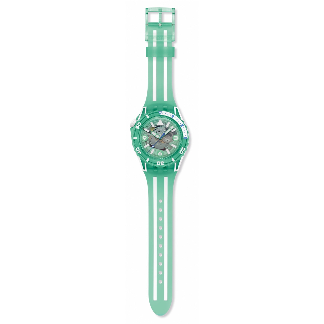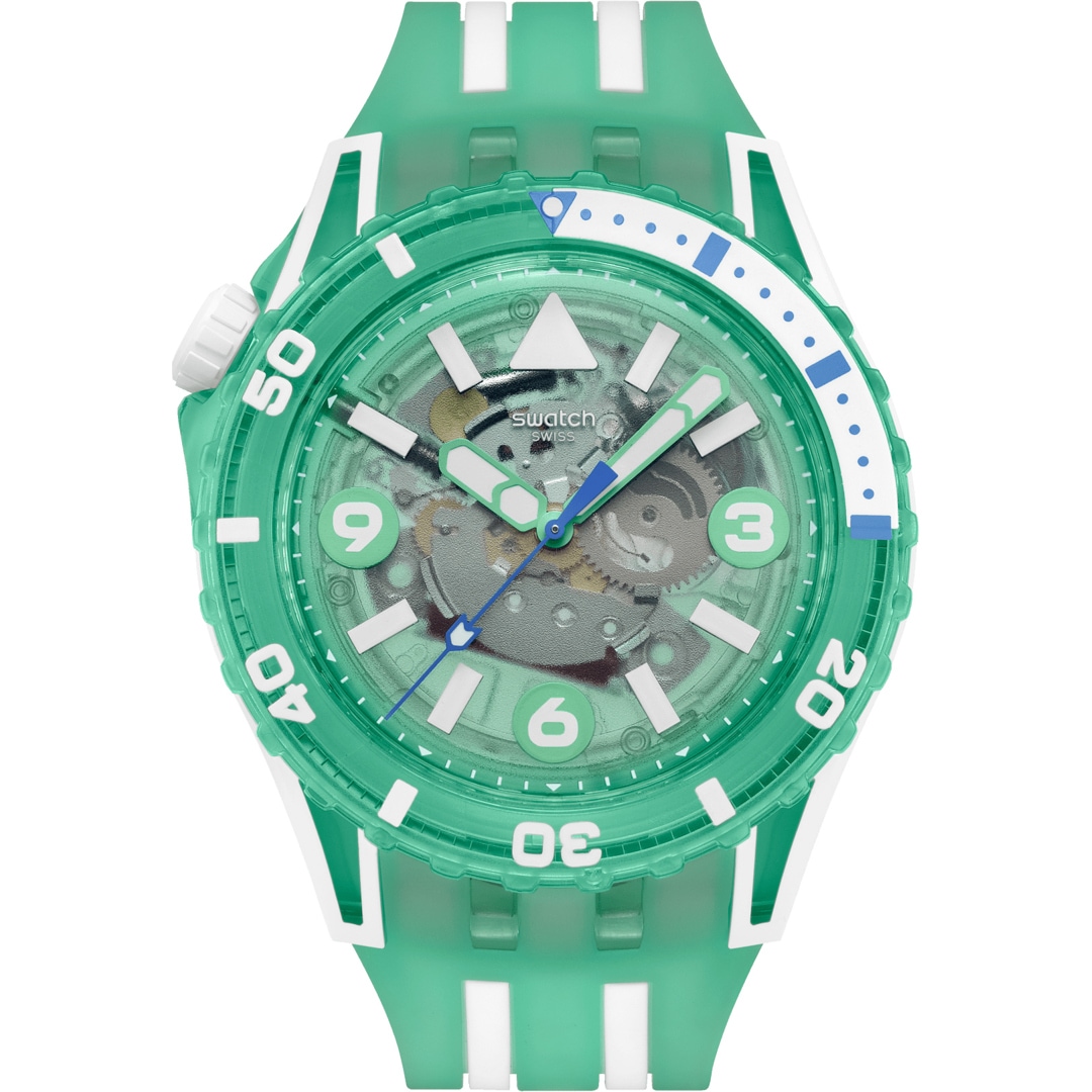 Das transparente, türkisfarbene Zifferblatt dieser Taucheruhr verfügt über weiss gedruckte Indizes und Ziffern, türkisfarbene Stunden- und Minutenzeiger sowie einen hellblauen Sekundenzeiger, alle fluoreszierend, unter biobasiertem Glas. Das Gehäuse kombiniert mattweisses Bioceramic und biobasiertes Material in einem glänzend-transparenten Türkis und ist mit einer biobasierten Lünette in glänzend-transparentem Türkis mit weiss-hellblauem Print, der im Dunkeln leuchtet, sowie einer Krone aus mattweissem Bioceramic bei 10 Uhr ausgestattet. Abgerundet wird das Modell mit einem Armband in Mattweiss und matt-transparentem Türkis mit einer matt-transparenten türkisfarbenen Schlaufe und einer Schliesse in glänzend-transparentem Türkis.