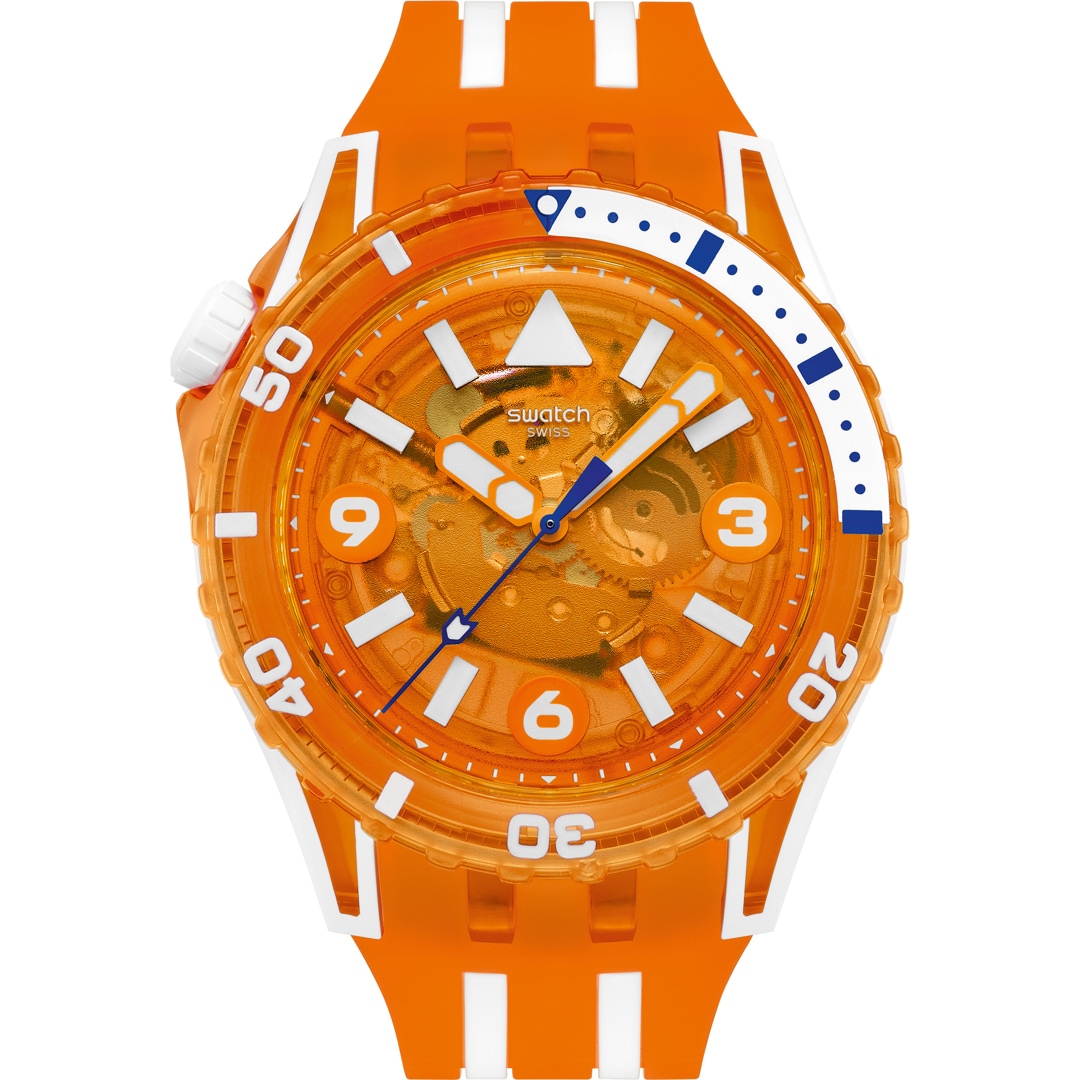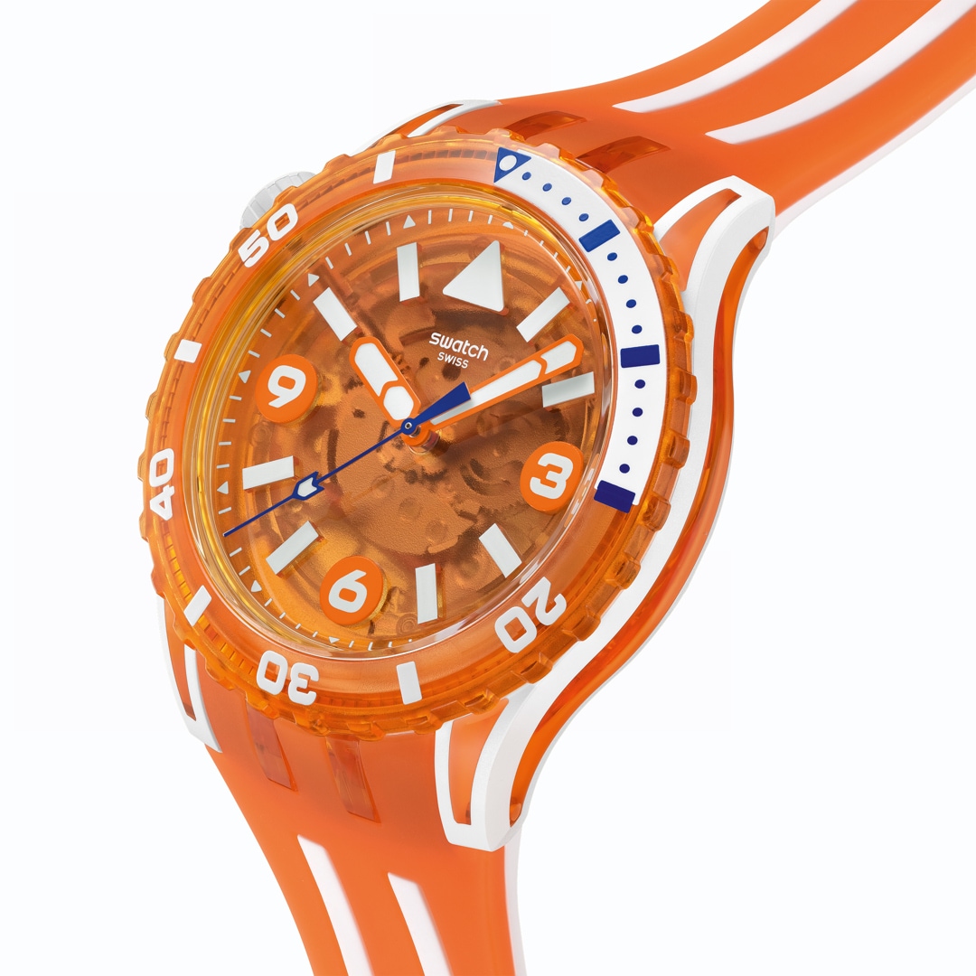 Das transparente, orangefarbene Zifferblatt dieser Taucheruhr verfügt über weiss gedruckte Indizes und Ziffern, orangefarbene Stunden- und Minutenzeiger sowie einen dunkelblauen Sekundenzeiger, alle fluoreszierend, unter biobasiertem Glas. Das Gehäuse kombiniert mattweisses Bioceramic und biobasiertes Material in einem glänzend-transparenten Orange und ist mit einer biobasierten Lünette in glänzend-transparentem Orange mit dunkelblau-weissem Print, der im Dunkeln leuchtet, sowie einer Krone aus mattweissem Bioceramic bei 10 Uhr ausgestattet. Abgerundet wird das Modell mit einem Armband in Mattweiss und matt-transparentem Orange und einer matt-transparenten orangefarbenen Schlaufe sowie einer glänzend-transparenten Schliesse.