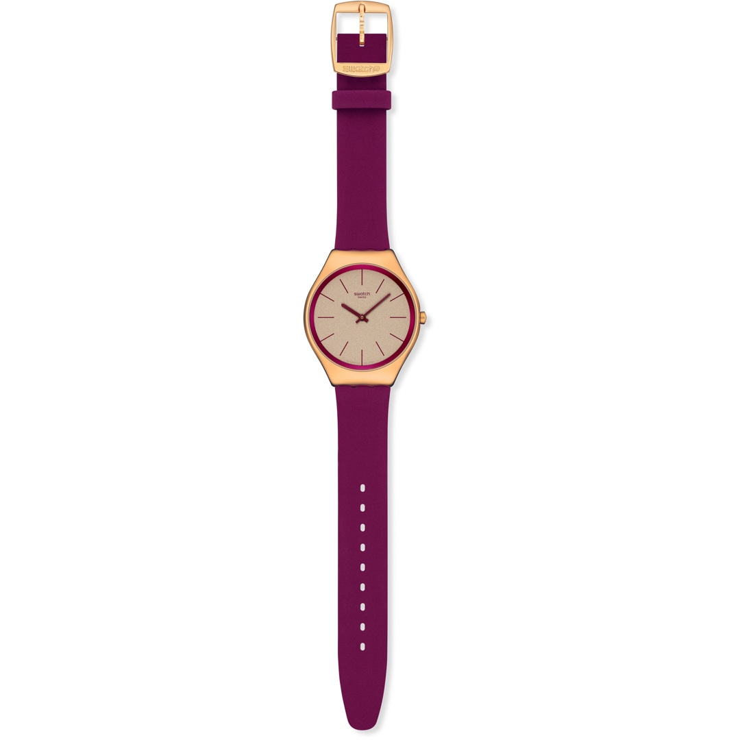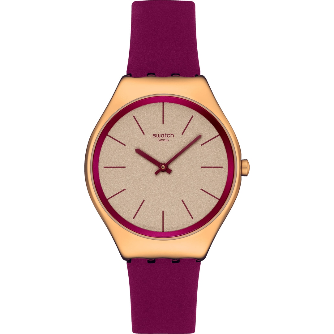 Diese ultraschmale Uhr verfügt über ein goldfarbenes Zifferblatt mit Glitzereffekt und gedruckte Stundenmarkierungen, einen Höhenring sowie Stunden- und Minutenzeiger in dunklem Rosa. Das Gehäuse aus poliertem Edelstahl mit einer roségoldfarbenen PVD-Beschichtung wird durch ein passendes Armband mit Schliesse und eine Schlaufe in dunklem Rosa ergänzt.