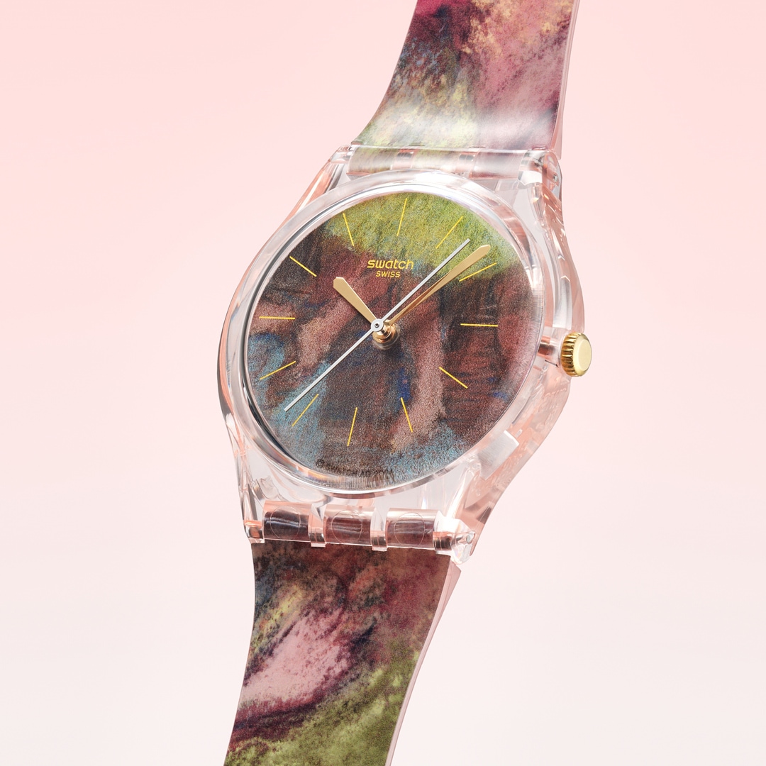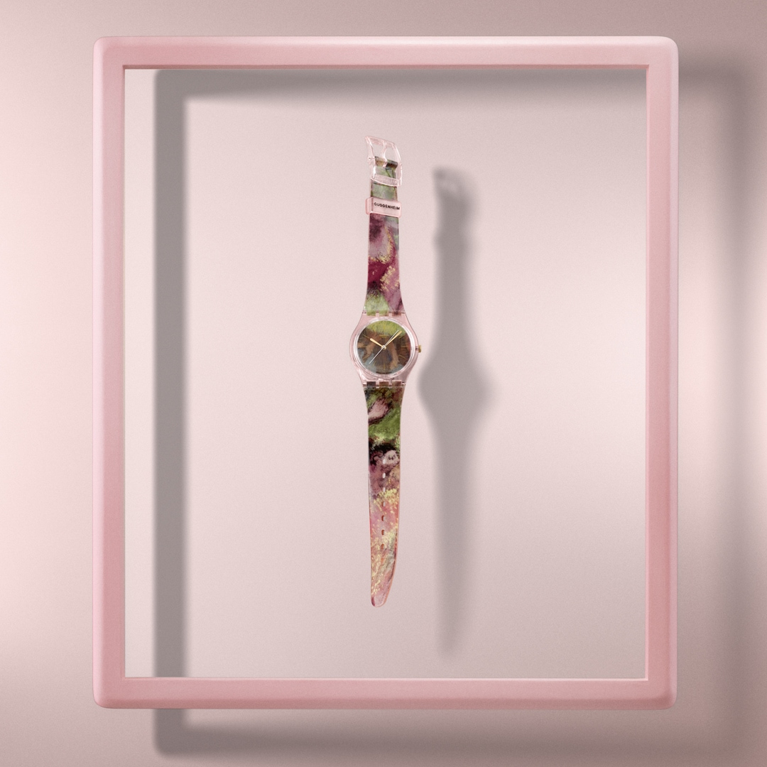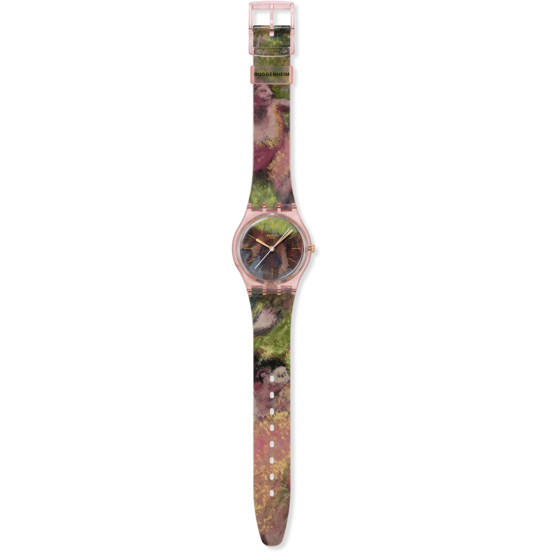 Diese Uhr aus der Swatch x Guggenheim Kollektion besticht durch ein biobasiertes Gehäuse in glänzendem Rosa und einem biobasierten Glas mit goldfarbenen Stundenmarkierungen. Das Zifferblatt und das transparente Armband in glänzendem Rosa sind mit einem Druck von Edgar Degas’ Kunstwerk „Dancers in Green and Yellow“ (Tänzerinnen in Grün und Gelb) versehen. Goldfarbene Stunden- und Minutenzeiger und ein weisser verlängerter Sekundenzeiger zeigen die Uhrzeit an. Die transparente mattrosafarbene Schlaufe ist mit dem Guggenheim-Logo bedruckt und rundet die Uhr zusammen mit der transparenten Schliesse in glänzendem Rosa ab.
