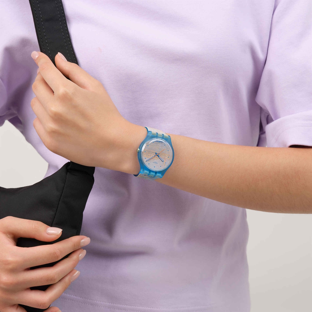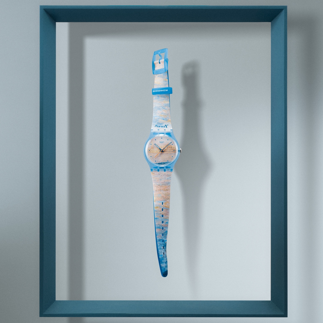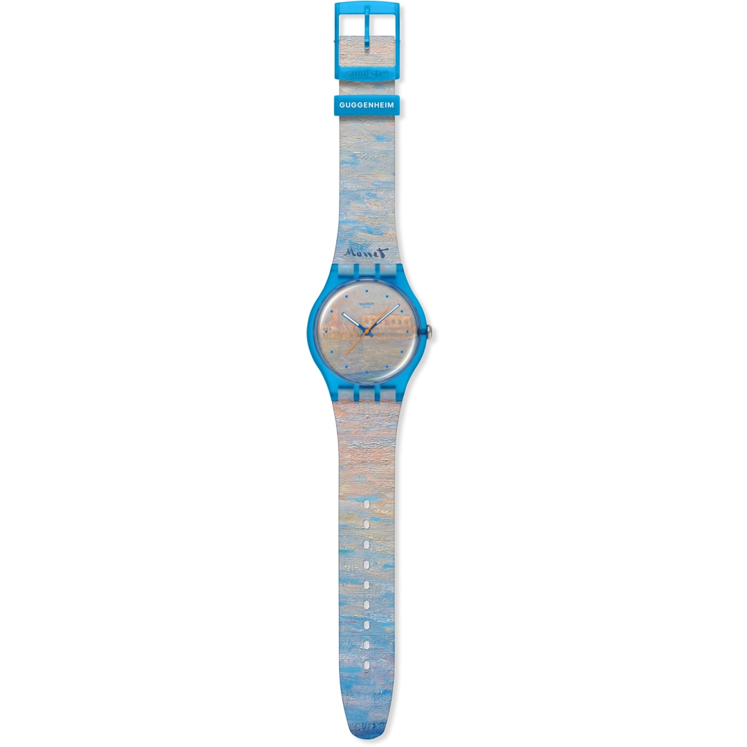 Diese Uhr aus der Swatch x Guggenheim Kollektion verfügt über ein transparentes biobasiertes Gehäuse in Mattblau mit biobasiertem Glas. Das Zifferblatt und das transparente mattblaue Armband sind mit einem Druck von Claude Monets Kunstwerk „The Palazzo Ducale, Seen from San Giorgio Maggiore“ versehen. Der mehrfarbige Druck auf dem Zifferblatt leuchtet unter UV-Licht orange.Fluoreszierende blaue Stunden- und Minutenzeiger und ein verlängerter orangefarbener Sekundenzeiger zeigen die Uhrzeit an. Die transparente mattblaue Schlaufe ist mit dem Guggenheim-Logo bedruckt und rundet gemeinsam mit der transparenten mattblauen Schliesse die Uhr ab.