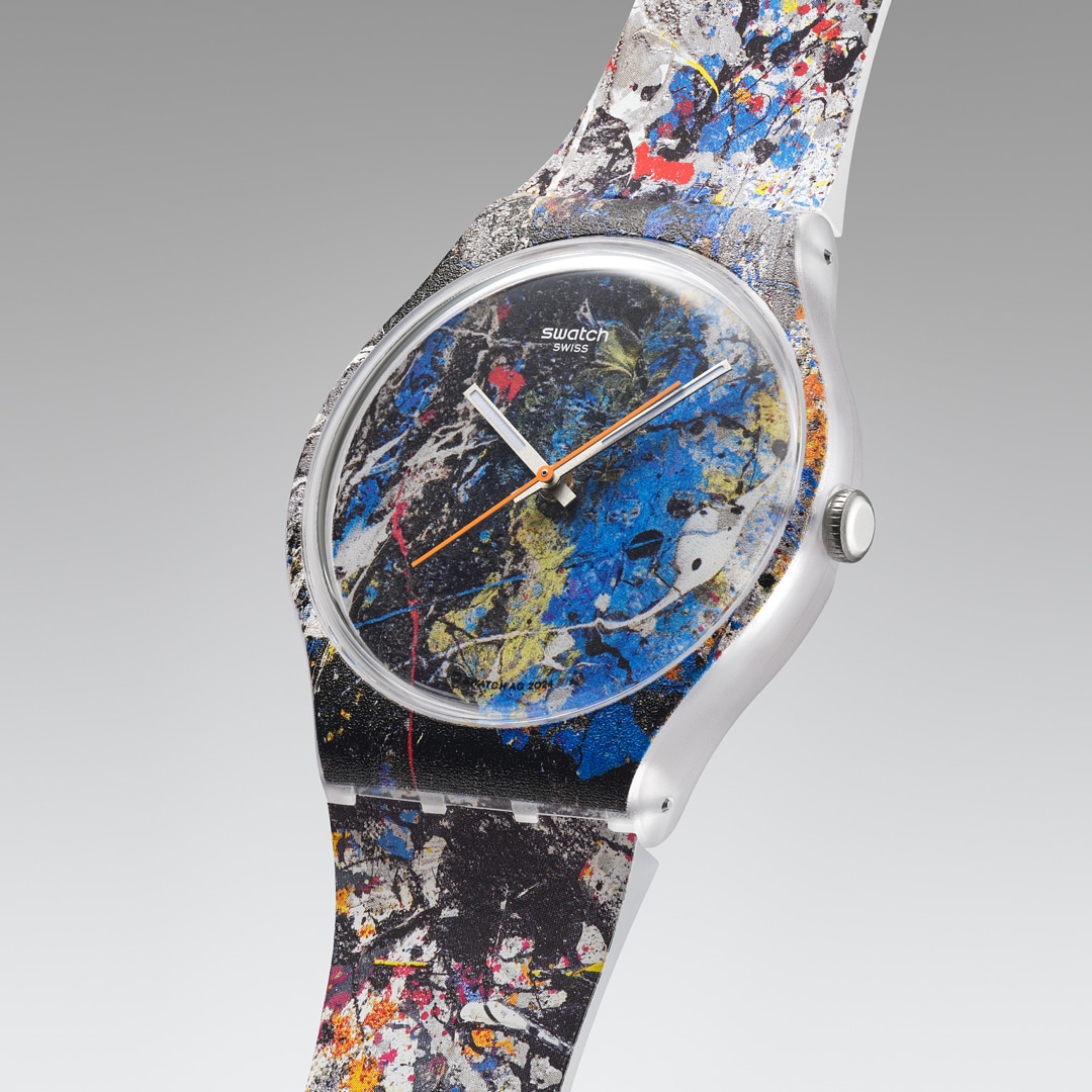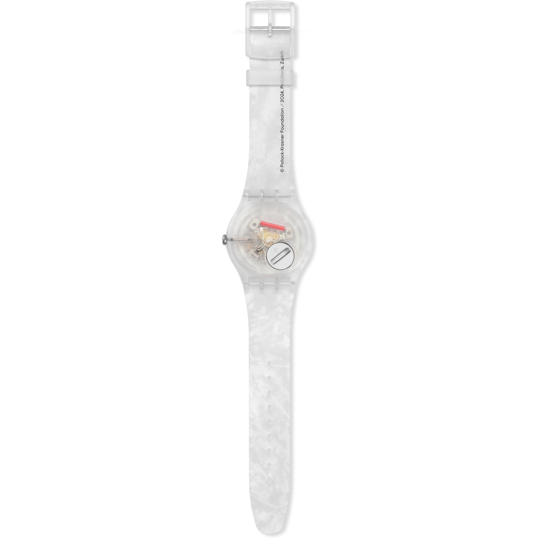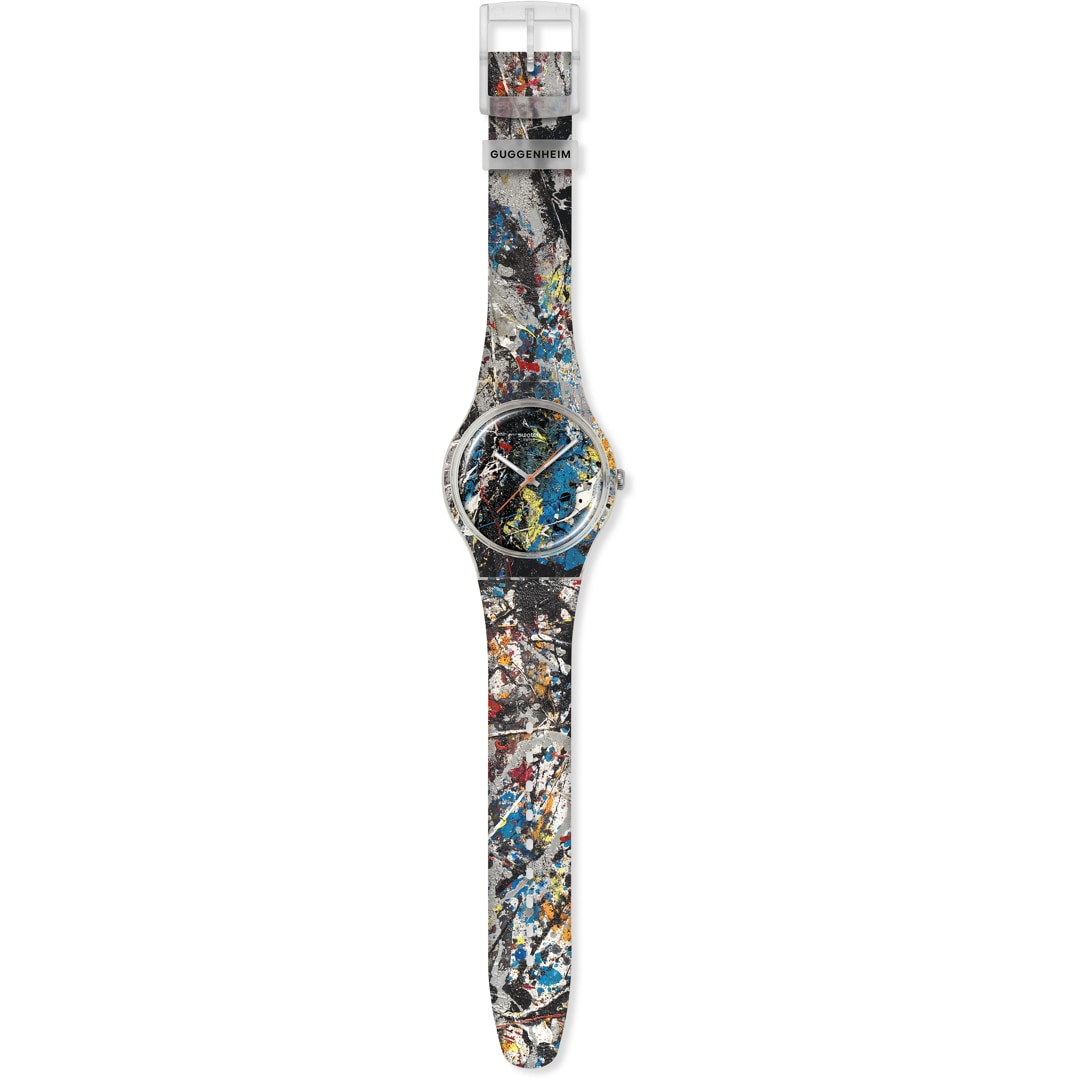 Diese Uhr aus der Swatch x Guggenheim Kollektion ist auf dem Zifferblatt, dem matten transparenten Gehäuse und dem Armband mit einem Druck von Jackson Pollocks Kunstwerk „Alchemy“ versehen. Fluoreszierende silberfarbene Stunden- und Minutenzeiger und ein verlängerter orangefarbener Sekundenzeiger zeigen die Uhrzeit an. Die matte transparente Schlaufe ist mit dem Guggenheim-Logo bedruckt und rundet zusammen mit der matten transparenten Schliesse die Uhr ab.