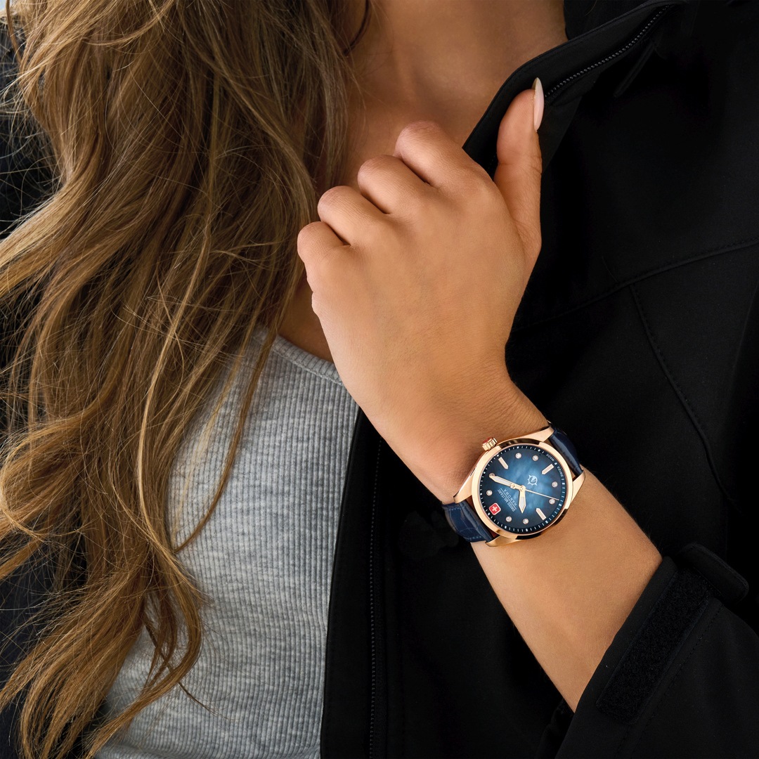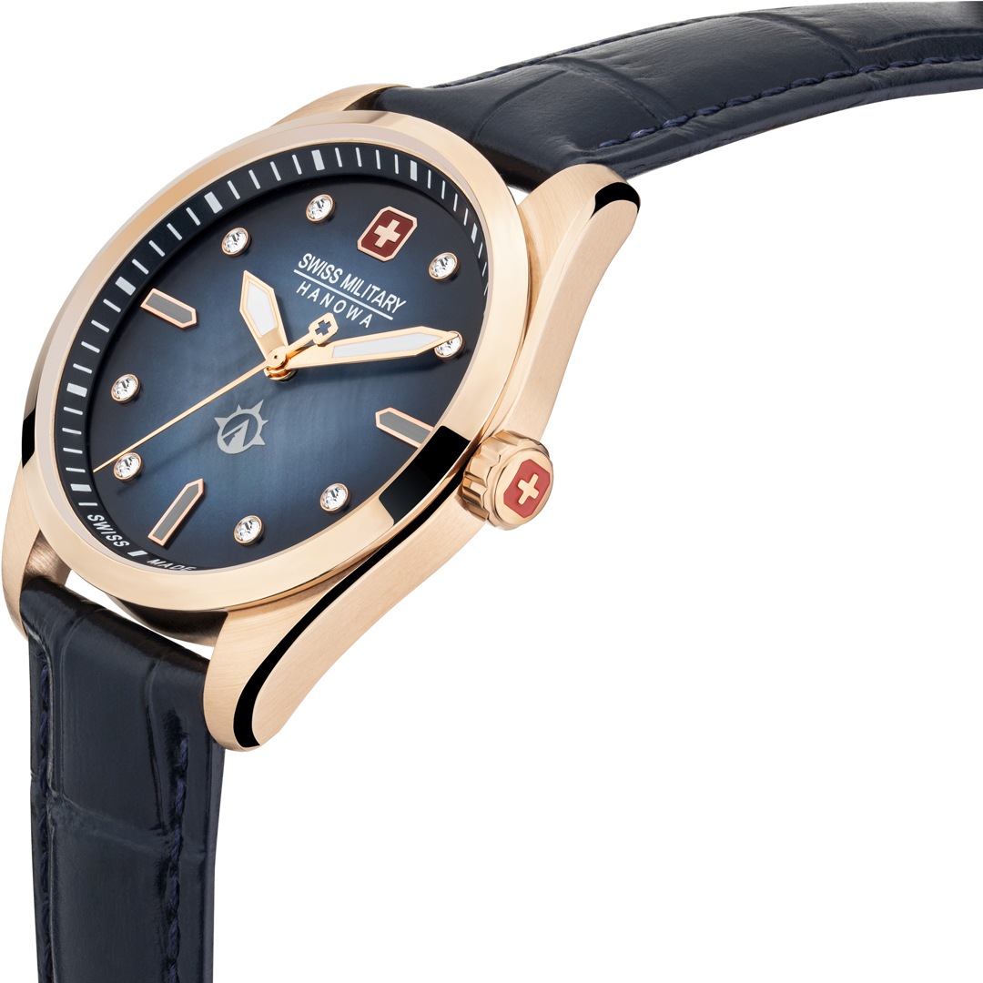 Die Mountain Crystal von Swiss Military Hanowa bezaubert mit seinem schimmernden Perlmutt-Zifferblatt. Die funkelnden Zirconia Steine sorgen für den extra Wow-Effekt.