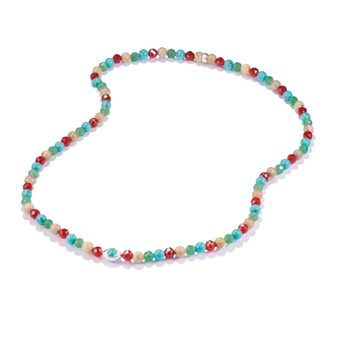 Farben mit Bedeutung – und ein Blick fürs Wesentliche: Diese Elyndra Kette kombiniert polierte Beads aus imitiertem Türkis für Ruhe und Klarheit, Daisy Jaspis für Erdung und Stabilität, facettierten roten Achat für Lebensenergie und grünen Aventurin für Zuversicht.