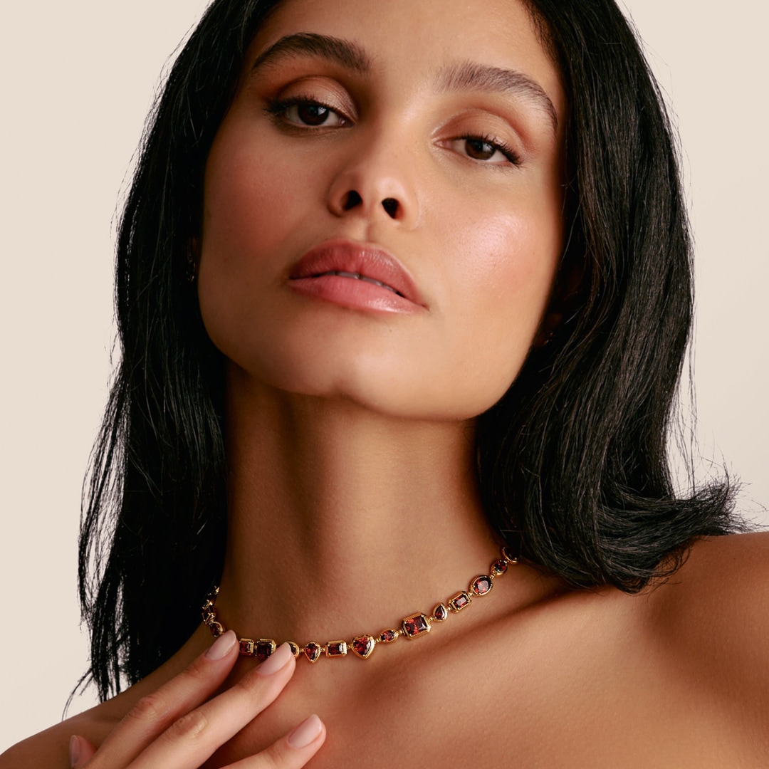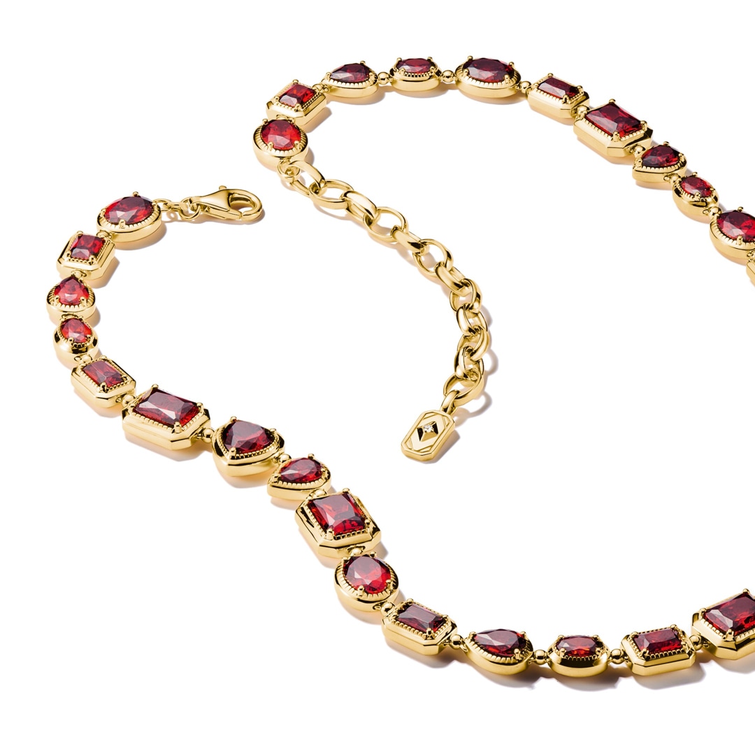 Intensiv wie ein leuchtendes Lichtband legt sich dieser Choker an deinen Hals. Vergoldetes, recyceltes 925 Sterling Silber trägt facettenreich geschliffene, granatrote Zirkoniasteine, deren rhythmische Abfolge ein harmonisches Spiel aus Kontrast und Tiefe schafft. Feine Gravurlinien und erhabene Dots rahmen jeden Stein ein und verstärken seine Leuchtkraft. Gold trifft Orange-Rot – für einen Look, der Energie, Sinnlichkeit und selbstbewusste Eleganz ausstrahlt, egal ob eng anliegend oder locker getragen.