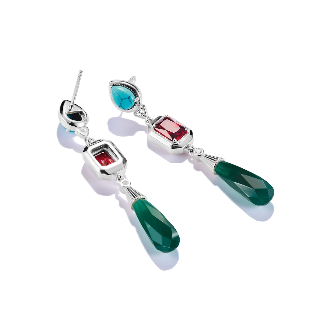 Ein Spiel aus Licht, Farbe und feiner Symbolik: Tropfenförmiger, imitierter Türkis fängt das Leuchten am Ohr, ein facettierter granatroter Zirkonia im Oktagonschliff setzt kraftvolle Energie frei, und der grüne Achat verleiht dem Design optimistische Tiefe. Unterschiedliche Schliffe und Grössen schaffen Bewegung und Präsenz, während das recyceltes 925 Sterling Silber einen modernen Rahmen bildet. Teil der Elyndra Kollektion – für Auftritte mit Charakter, Leichtigkeit und stilvoller Aussage.