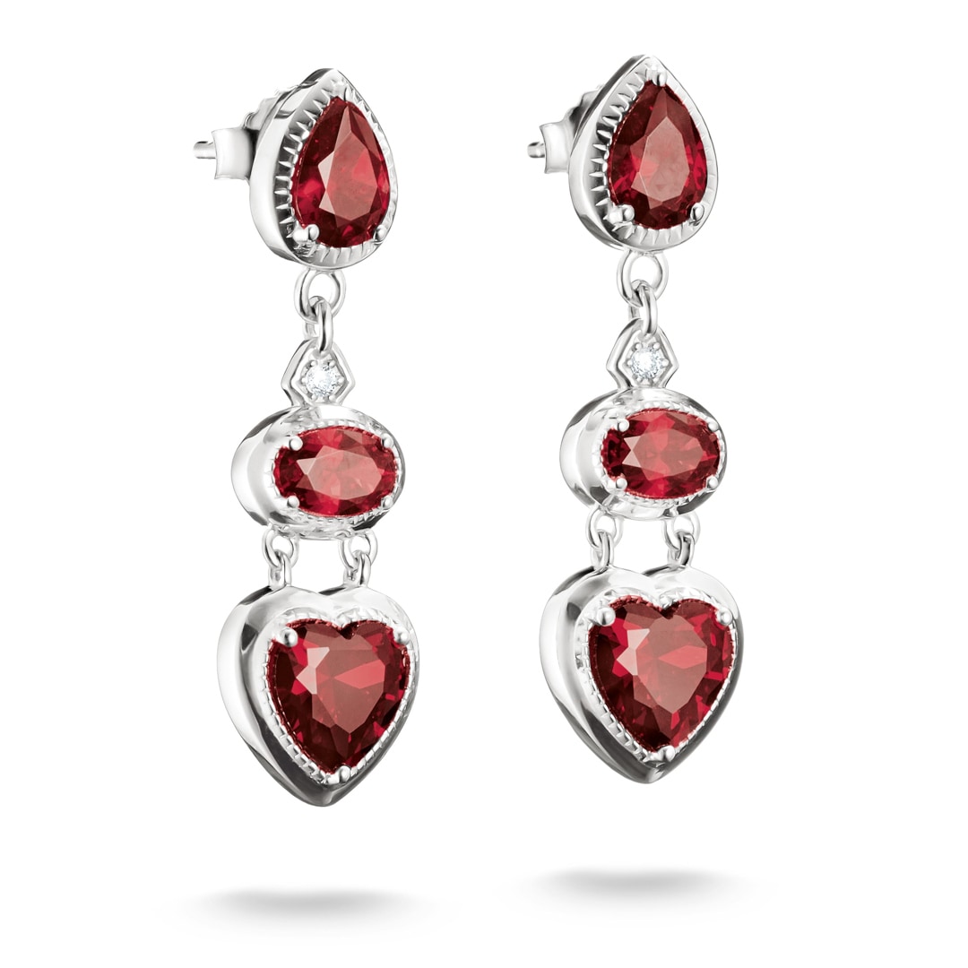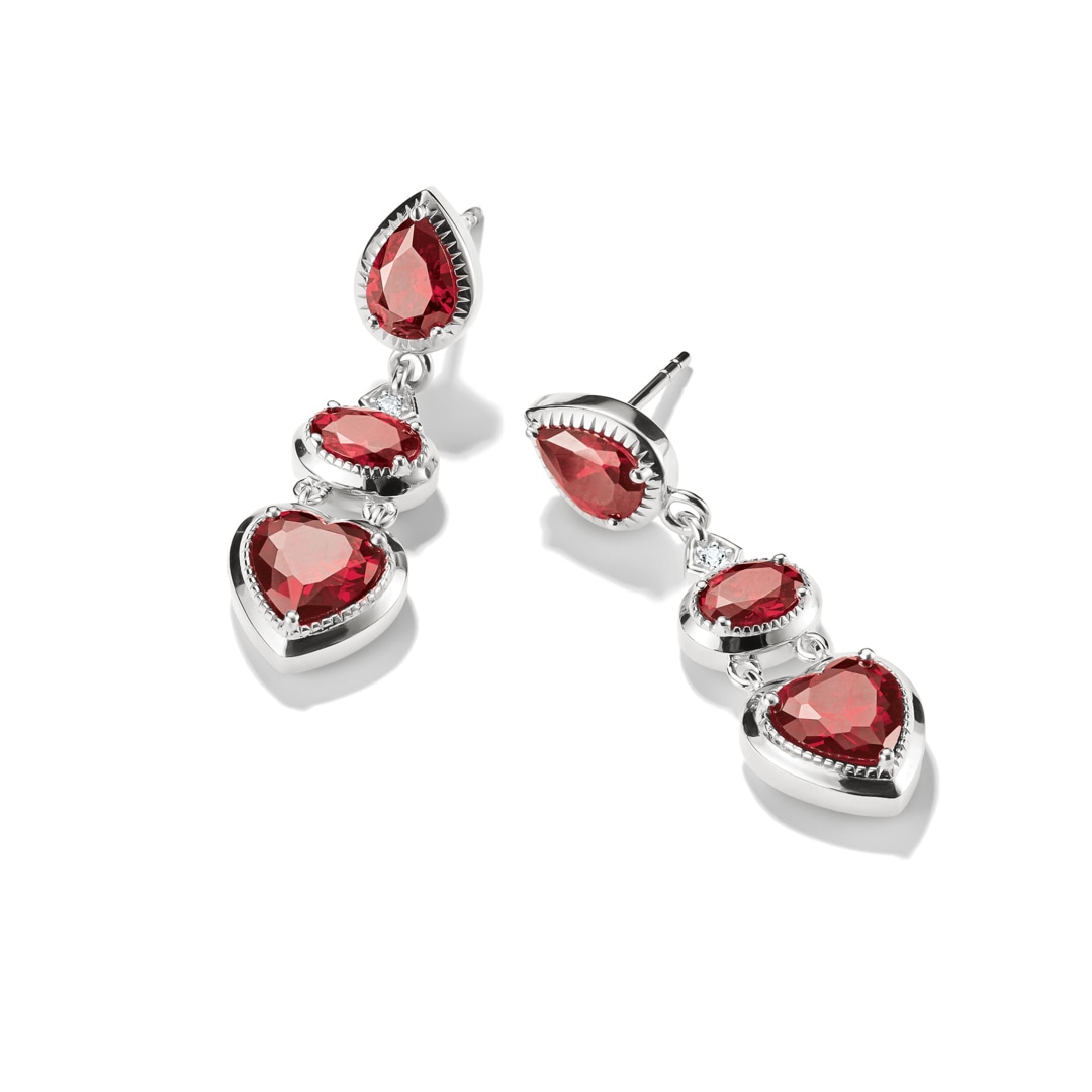 Wie ein Liebesversprechen in Schmuckform: Diese romantischen Elyndra Ohrhänger aus recyceltem 925 Sterling Silber vereinen funkelnde Formen und kräftiges Granatrot zu einer Hommage an die Liebe.