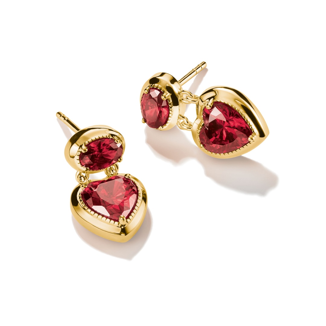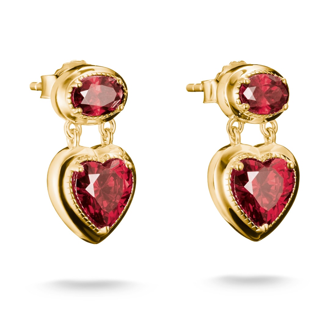 Diese vergoldeten Elyndra Ohrstecker erzählen die Sprache der Liebe in funkelnder Form. aus recyceltem 925 Sterling Silber mit edler Vergoldung gefertigt, vereinen sie zwei granatrote Zirkoniasteine – einen im Ovalschliff, den anderen im Herzschliff – zu einem beweglichen Duo.