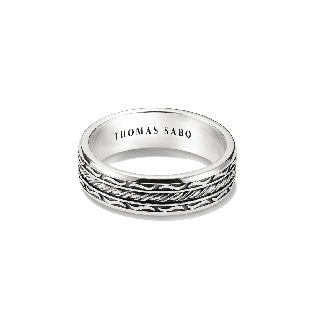 Klare Form, starke Details: Dieser Bandring überzeugt mit einer markanten Silhouette und spannender Struktur. Aus geschwärztem 925 Sterling Silber gefertigt, zeigt das Design sanft abgestufte Ebenen und einen gedrehten Steg in der Mitte – ein kraftvoller Akzent, der an Lederriemen oder Seilstrukturen erinnert.
