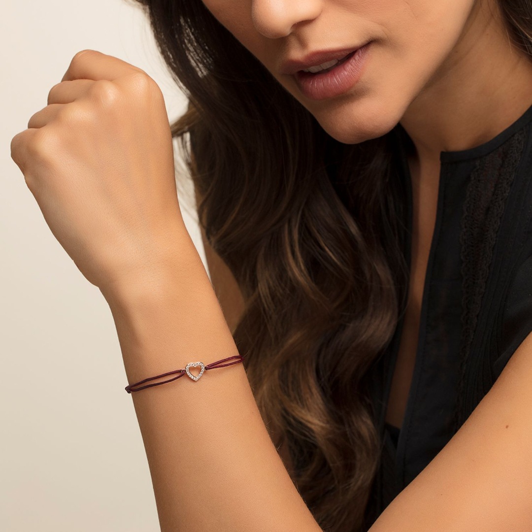 Das feine, handgeknüpfte farbige Textilarmband – ideal für vielseitig kombinierbare Styles – überrascht mit einem Herz-Anhänger, dessen Cut-out-Optik durch den Stein-Besatz unterstrichen wird.