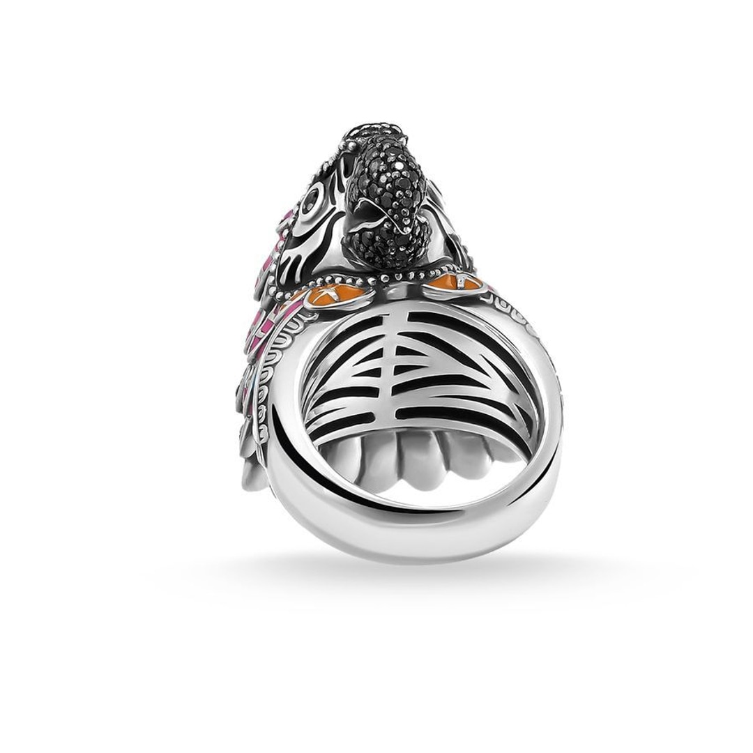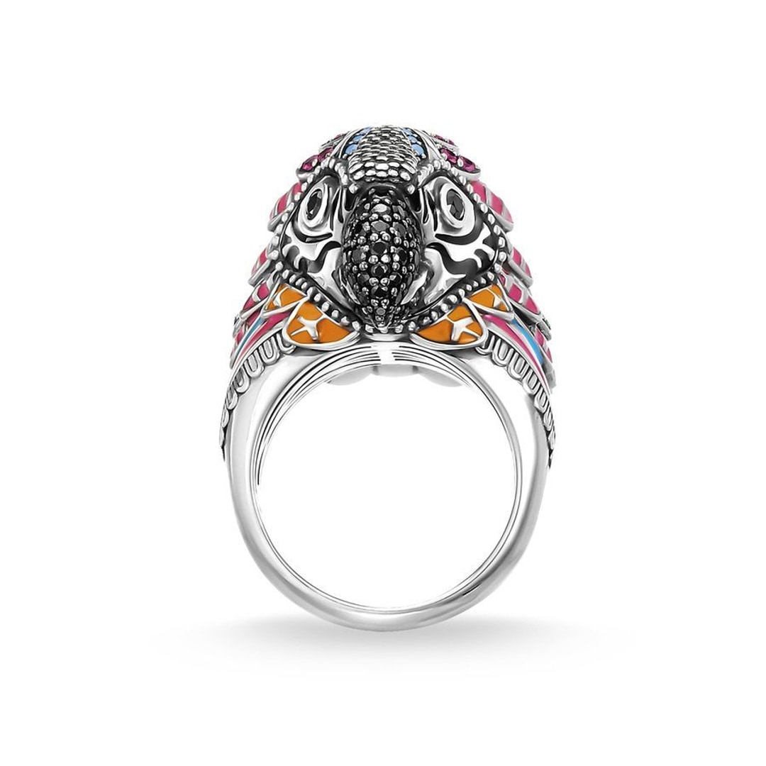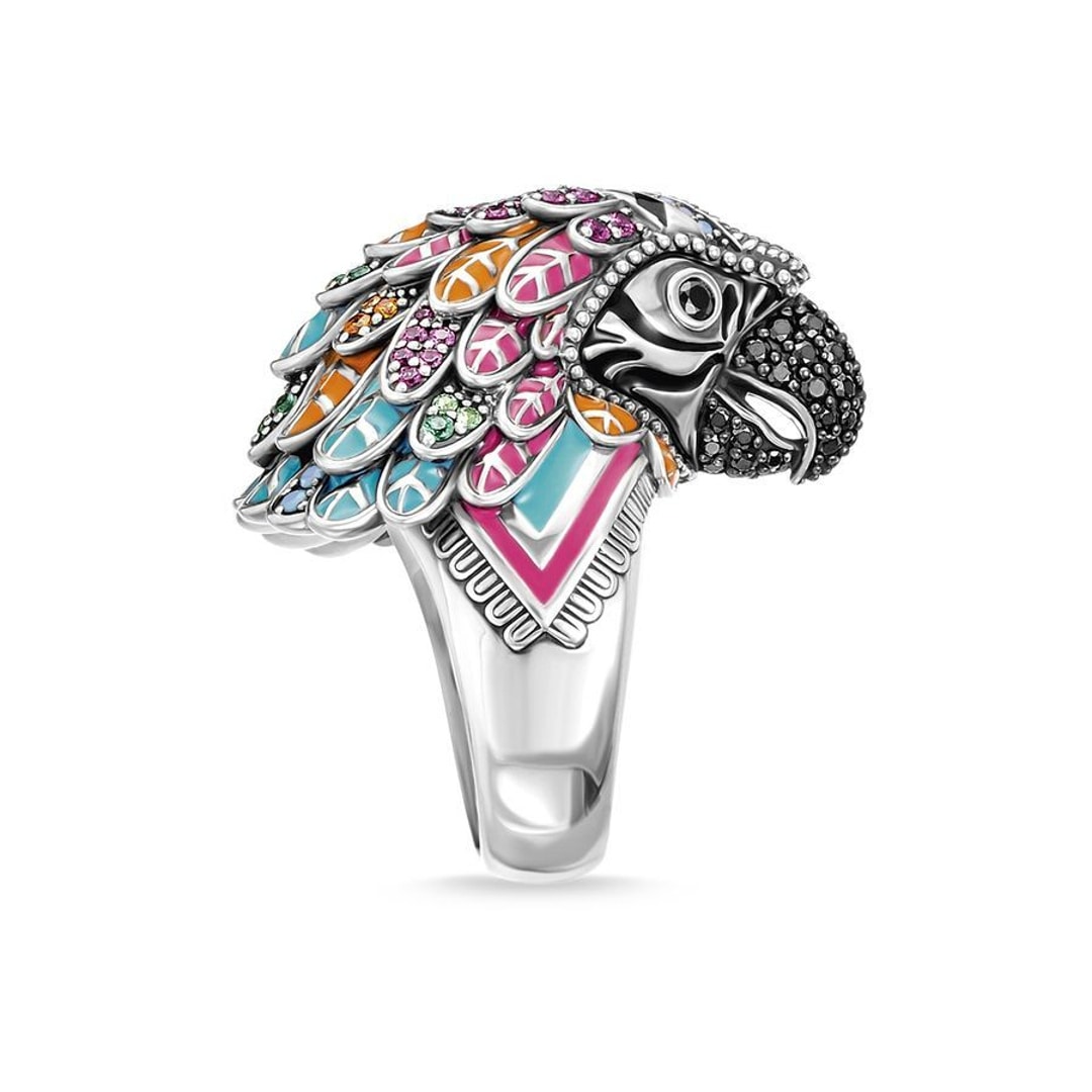 Der Mythos des Dschungels, umgesetzt in einem Statement-Schmuckstück: Kunstvoll von Hand mit rund 110 Steinen und Kaltemaille verziert, strahlt das Gefieder des THOMAS SABO Papageien-Rings bis ins Detail mit seiner Farbenpracht. Grafische Elemente, inspiriert von der Ornamentik versunkener Azteken-Tempel, vollenden das aussergewöhnliche Design.