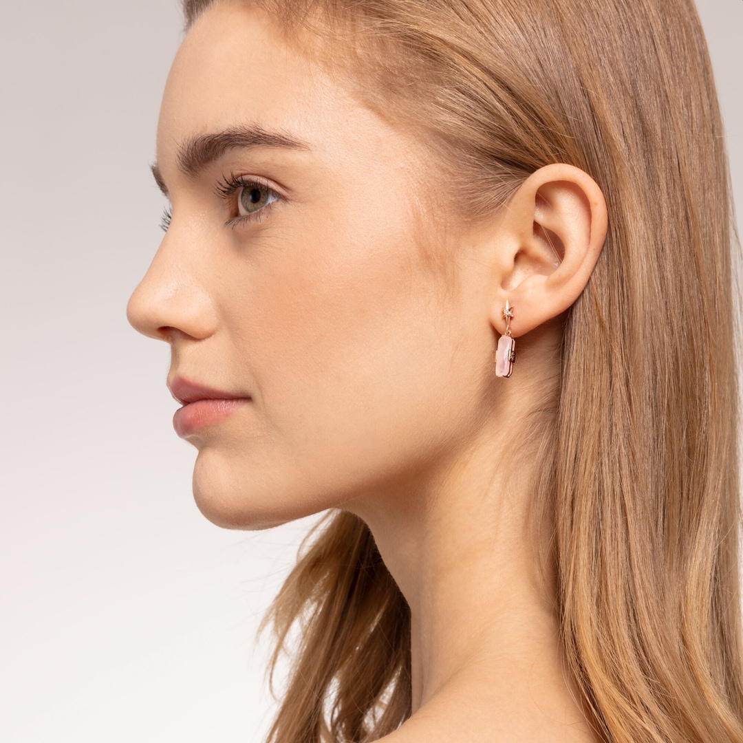 Magische Ohrringe, die mit der Pastellfarbe des im Oktagon-Schliff facettierten Rosenquarzes und dem glückbringenden Sternendesign zum Eyecatcher werden.