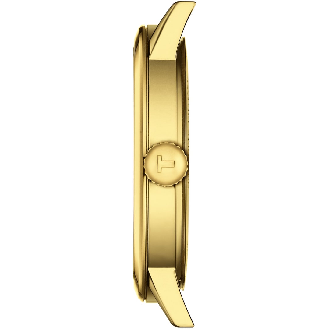 Die Tissot Classic Dream verfügt über ein vergoldetes Edelstahlgehäuse, kratzfestes Saphirglas sowie ein präzises Swiss Made Quarzwerk mit Endanzeige der Batterielebensdauer. Das Zifferblatt mit Datumsanzeige und schmalen Indexen verleiht der Uhr einen klassischen Look.