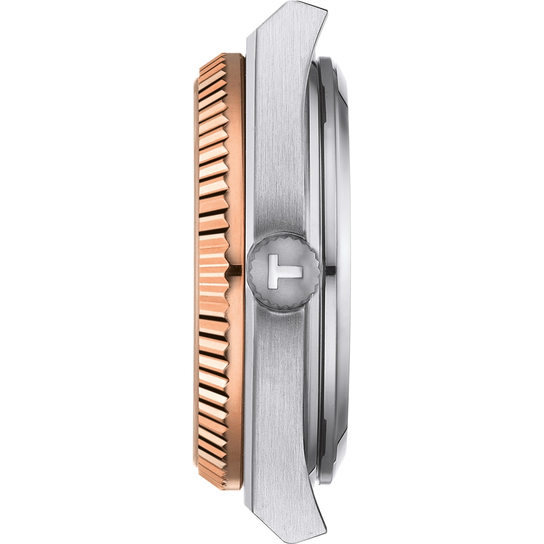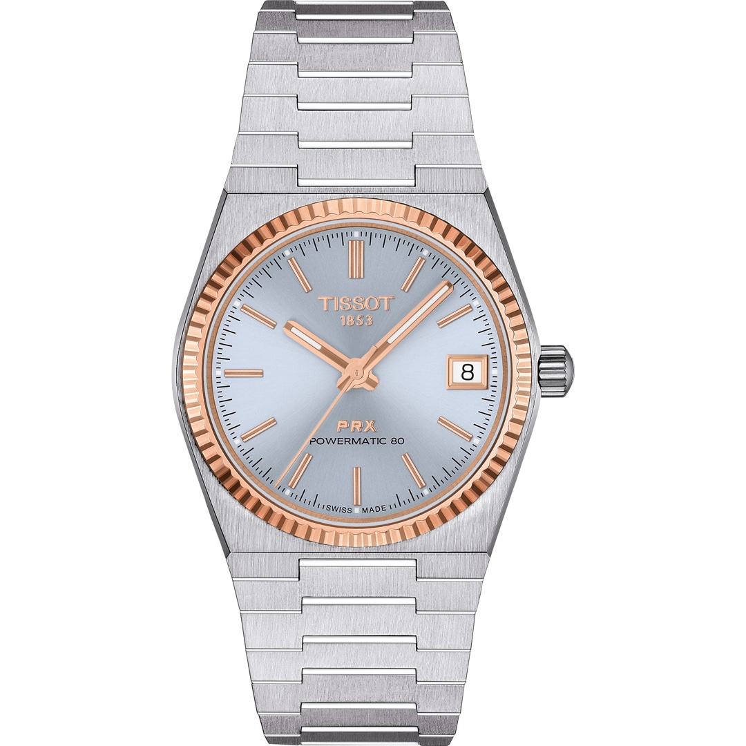 Dieses Tissot PRX Goldlünette 35mm Modell verfügt über ein 316L-Edelstahlgehäuse mit einer massiven, kannelierten 18K Roségoldlünette. Auf dem eisblauen Zifferblatt mit Datumsanzeige sitzen roségoldfarbene Indizes sowie gleichfarbige, mit SuperLuminova Leuchtmasse beschichtete Stabzeiger. Kratzfestes, beidseitig entspiegeltes Saphirglas sorgt für Schutz sowie beste Ablesbarkeit. Durch den Mineralglas-Sichtboden hindurch lässt sich das präzise Powermatic 80 Automatikwerk bei seiner unermüdlichen Arbeit beobachten. Das integrierte 316L-Edelstahlarmband besitzt ein Schnellwechselsystem und eine Butterfly-Faltschließe mit Drückern.