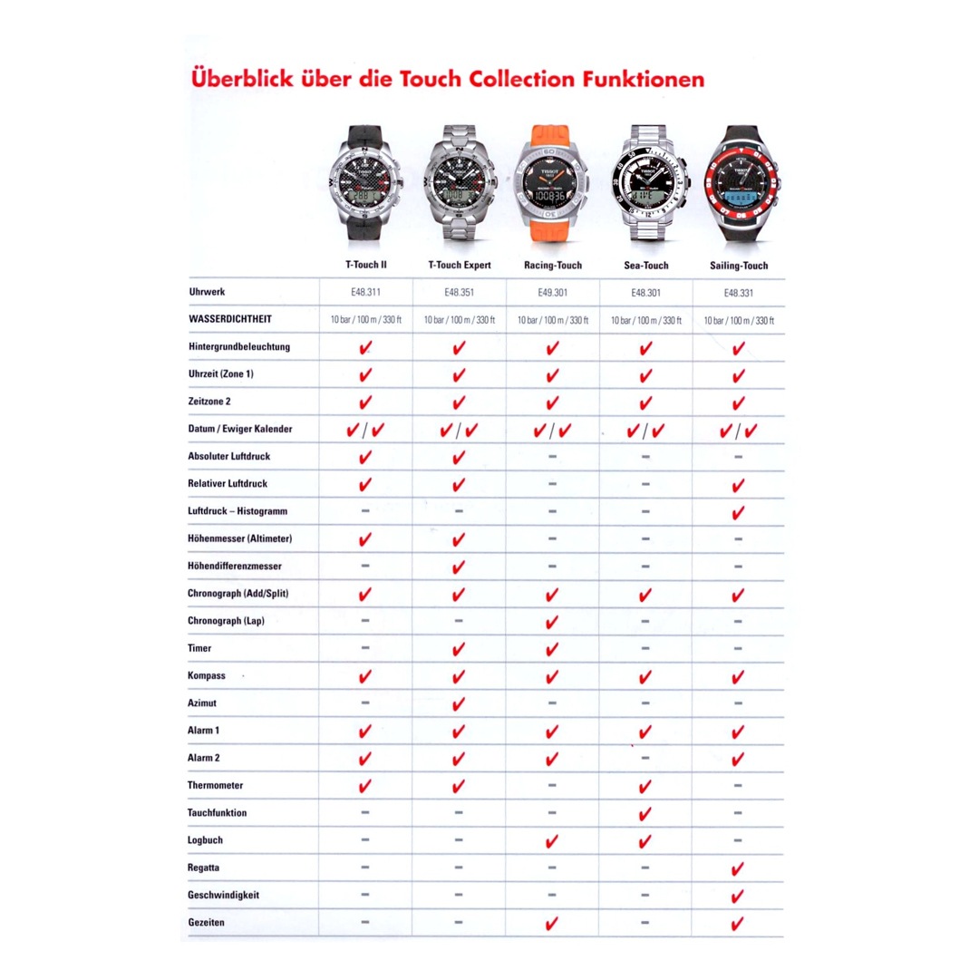 | Weitere Details | Durch berühren des Uhrenglas anwählbare Funktionen wie Stunde, Minuten, Chronograph (Zwischenzeit, additive und sequentielle Zeitmessung), Bordbuch, 2 Zeitzonen, 2 Wecker, Gezeitenrechner, Kompass, Rückbeleuchtung |