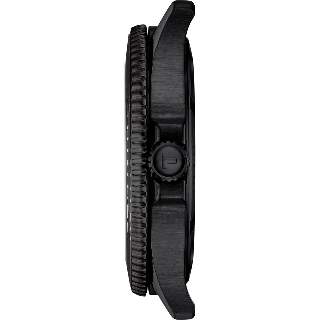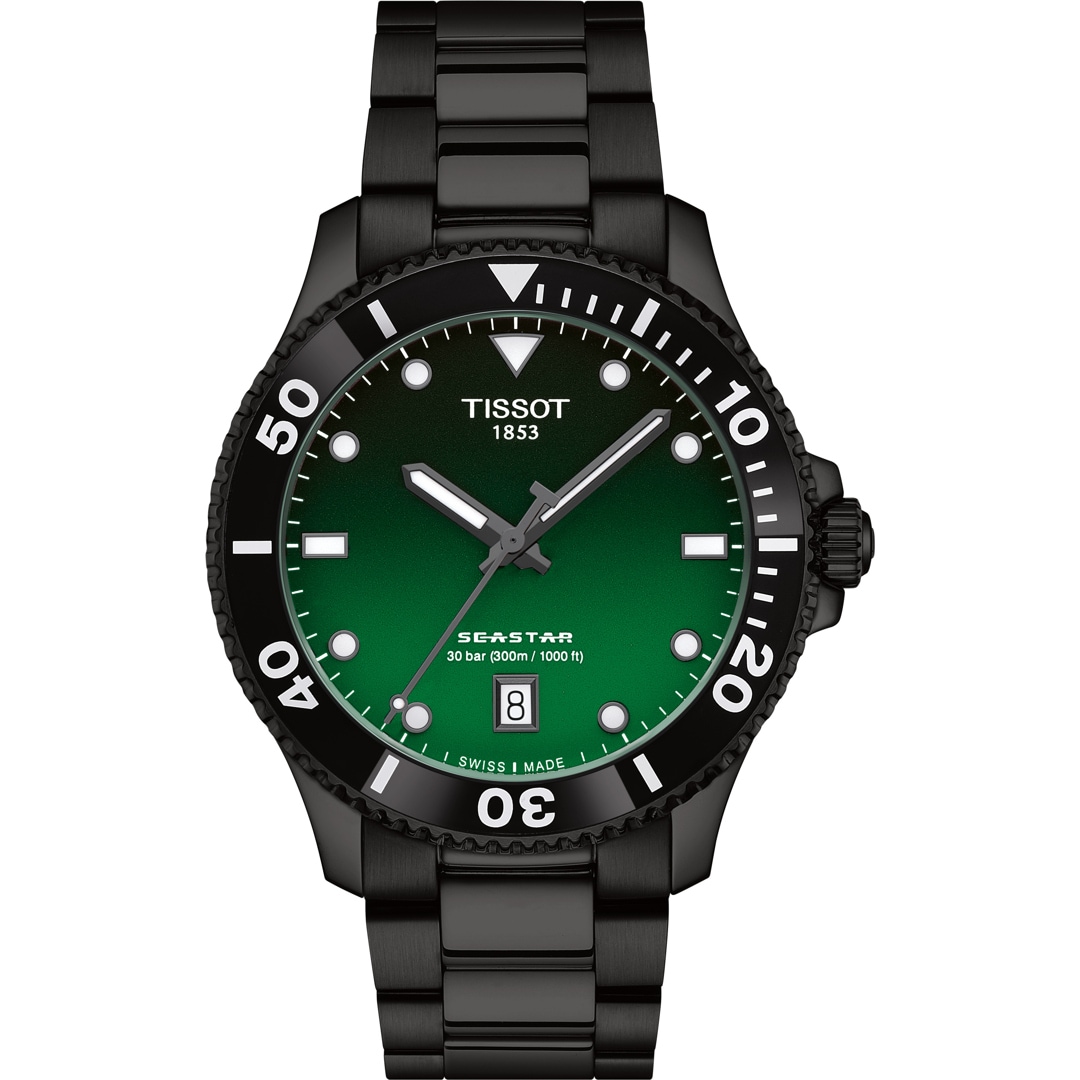 Dieses Tissot Seastar 1000 40mm Modell besitzt ein 316L-Edelstahlgehäuse mit schwarzer PVD-Beschichtung. Die auf der Lünette abgetragenen Ziffern und Markierungen in Weiss heben sich kontraststark ab. Dasselbe gilt für die Zeiger und Indizes auf dem Zifferblatt mit Datumsanzeige, das einen Farbverlauf von Schwarz zu Grün aufweist. Ihre grosszügige, weisse Super-LumiNova® Leuchtmasse-Beschichtung leuchtet im Dunkeln grünlich. Das 316L-Edelstahlarmband, ebenfalls mit schwarzer PVD-Beschichtung versehen, ist mit einem Schnellwechselsystem sowie mit einer Faltschliesse mit Sicherung und Drückern ausgestattet.