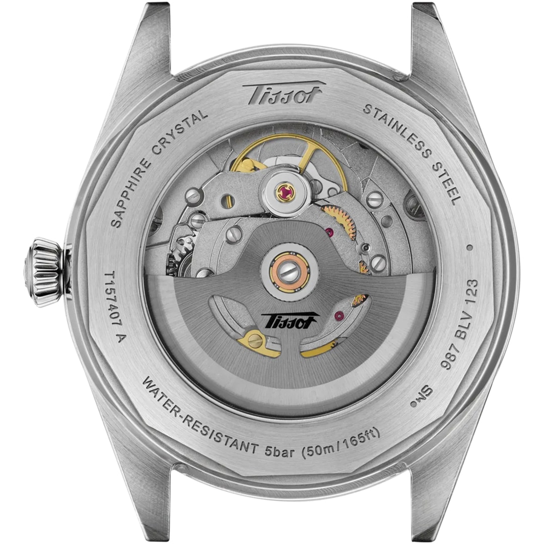 Der gläserne Gehäuseboden gibt den Blick auf die raffinierte Mechanik des Powermatic 80-Uhrwerks mit Nivachron-Spirale frei, das eine Gangreserve von bis zu 80 Stunden bietet. Mit Super-LumiNova®-Leuchtmasse beschichtete Dauphine-Zeiger sorgen auch bei schlechten Lichtverhältnissen für gute Ablesbarkeit.
