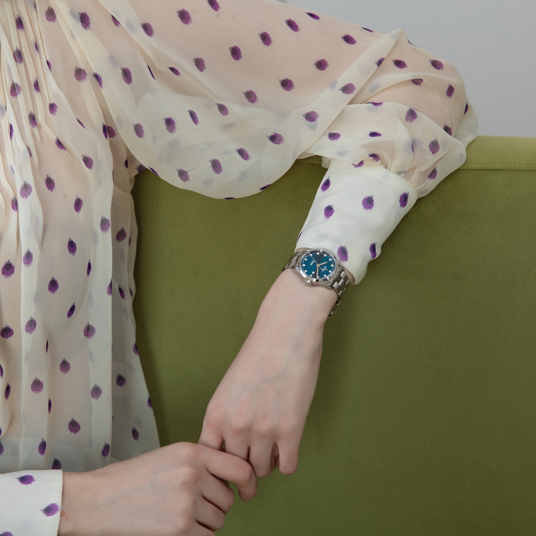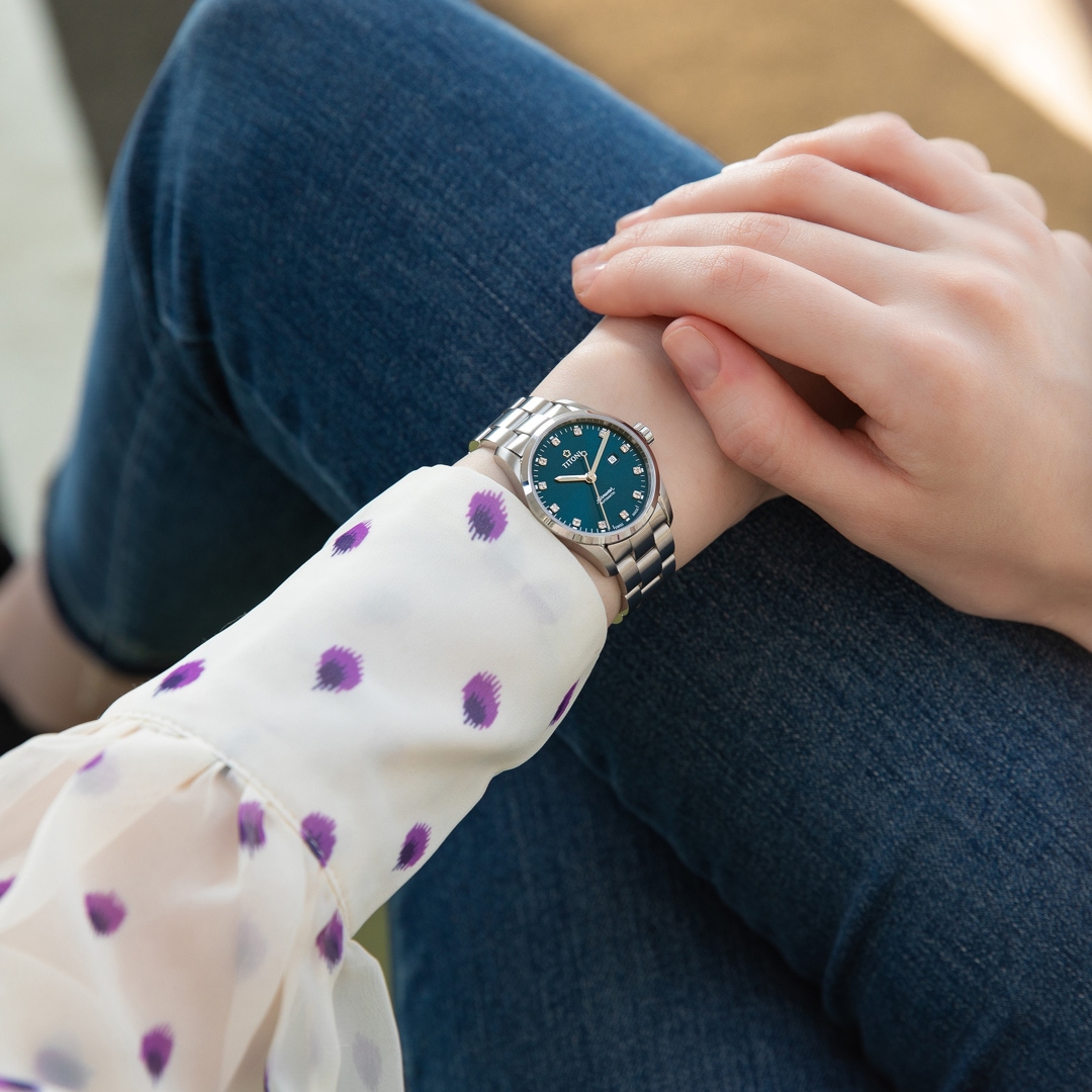 Das grössere Sichtfenster ermöglicht nicht nur ein schnelleres und bequemeres Ablesen der Zeit, sondern wirkt auch besonders dynamisch. Die prächtig funkelnden Steine auf dem Zifferblatt dienen als Indexe und machen dieses Modell zu einem absoluten Blickfang. Der Sekundenzeiger in Marineblau sorgt für einen frischen Gesamteindruck.