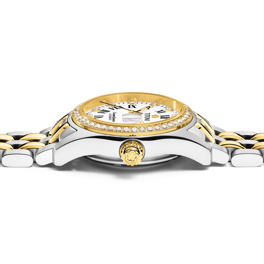 Das charakteristische Merkmal dieser Uhr sind ihre Kesselfassungen: Sie sind mit funkelnden Steinen besetzt und machen die Uhr damit zu einem echten Schmuckstück. In das Saphirkristallglas ist eine Zykloplinse integriert, die das Datum vergrössert und dadurch das Ablesen erleichtert. Die römischen Ziffern, die diese Uhr zieren, sind eine Reminiszenz an die Eleganz klassischer europäischer Kultur. Durch sie wird TITONI's Cosmo zu einer perfekten Ergänzung Ihrer Festtags- und Abendgarderobe.