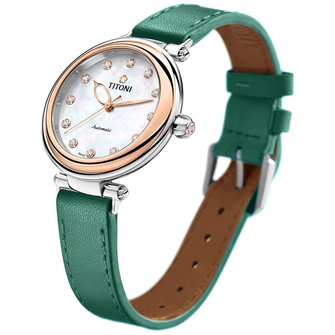 Das bezaubernde Design der TITONI-Serie Miss Lovely ist eine erfrischende und verspielte Neuinterpretation femininer Eleganz. Mit ihrer aparten Ästhetik ziert diese Automatikuhr das Handgelenk ihrer Trägerin auf besonders anziehende Weise. Die spielerischen Elemente verleihen dem klassischen Ideal vollendeter Weiblichkeit eine weiche und anmutige Note.
