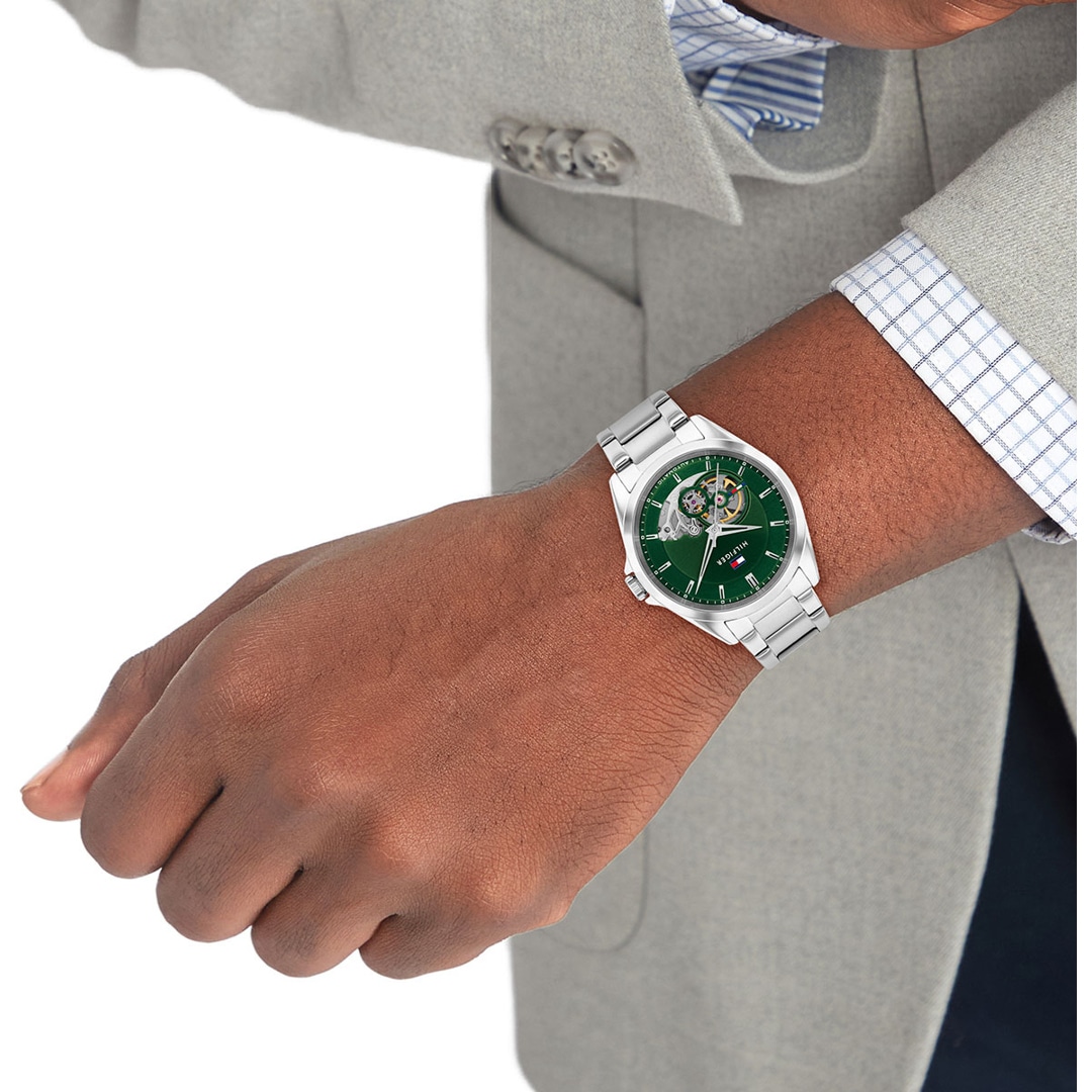 Die stilvolle Armbanduhr von Tommy Hilfiger mit Automatik-Werk und Edelstahlarmband ist das passende Accessoire für jeden Mann. Das runde Gehäuse und das Armband kreieren eine zeitlos-klassische Optik, während das kontrastierende Zifferblatt dieses Profil harmonisch ergänzt und gekonnt modische Akzente setzt.
