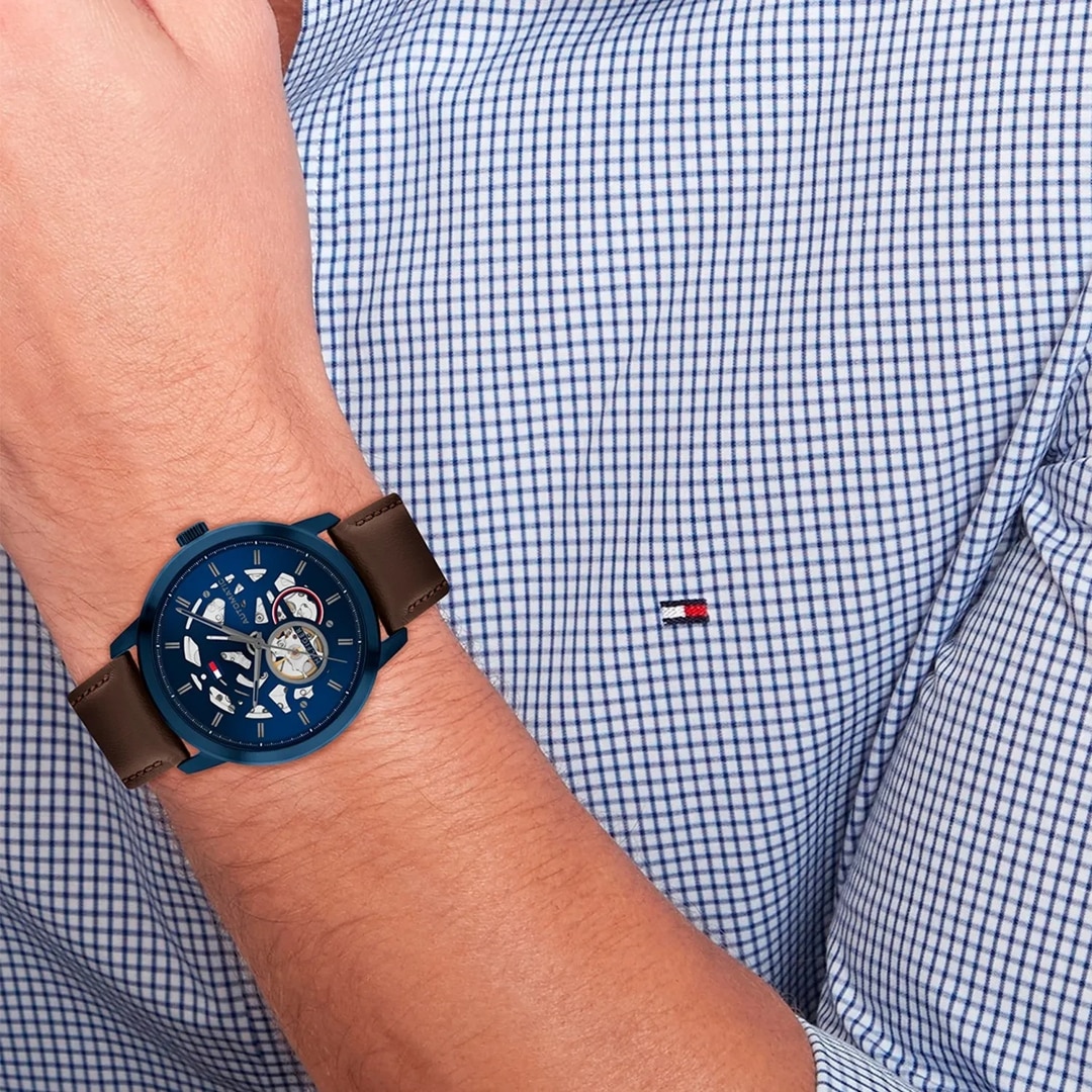 Ein Blick in die Vergangenheit - Die Henry Automatic aus dem Hause Tommy Hilfiger verleiht der hochmodernen Uhrmacherkunst einen wohl begründeten Hauch Nostalgie, indem sie die heutige Technologie in ein stilvoll traditionelles Design kleidet. Das sichtbare Automatikwerk verkörpert einen eleganten Stil, der sich selbst nie zu ernst nimmt. Diese Herrenuhr ist ein zeitgenössischer Zeitmesser für Ihren Alltag im Büro oder Ihre Freizeit. Auch bei festlichen Anlässen macht die Uhr eine gute Figur.
