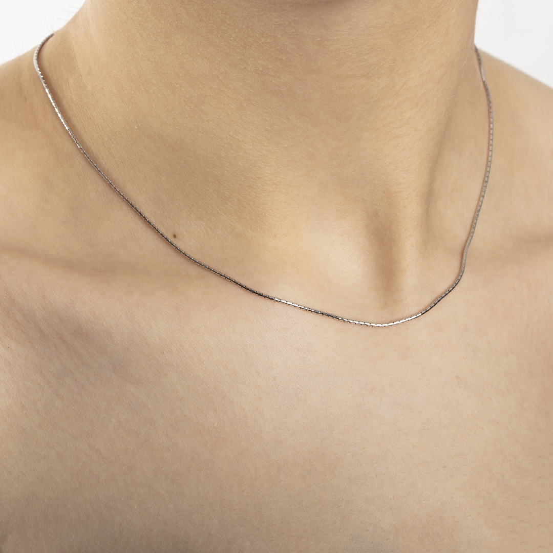 Hochwertige Venezianerkette, rund, aus 750/18 K Weissgold mit einer Breite von 1.0mm. Die Kette ist in 5 Längen zwischen 38 und 50cm erhältlich und verfügt über einen Karabinerverschluss, der ein sicheres Schliessen ermöglicht. Dieses schlichte und zeitlose Schmuckstück ist das perfekte Accessoire zu jedem Outfit.