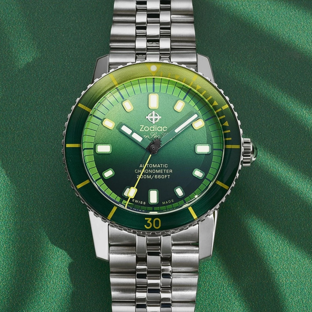 Die Zodiac Super Sea Wolf Compression vereint luxuriöse Eleganz mit Abenteuergeist. Ihr 40-mm-Edelstahlgehäuse umrahmt ein raffiniert gebürstetes Zifferblatt, dessen Farbverlauf von tropischen Ananas-Tönen inspiriert ist – ein dezenter Hinweis auf die Lebensfreude und den Genuss besonderer Momente.