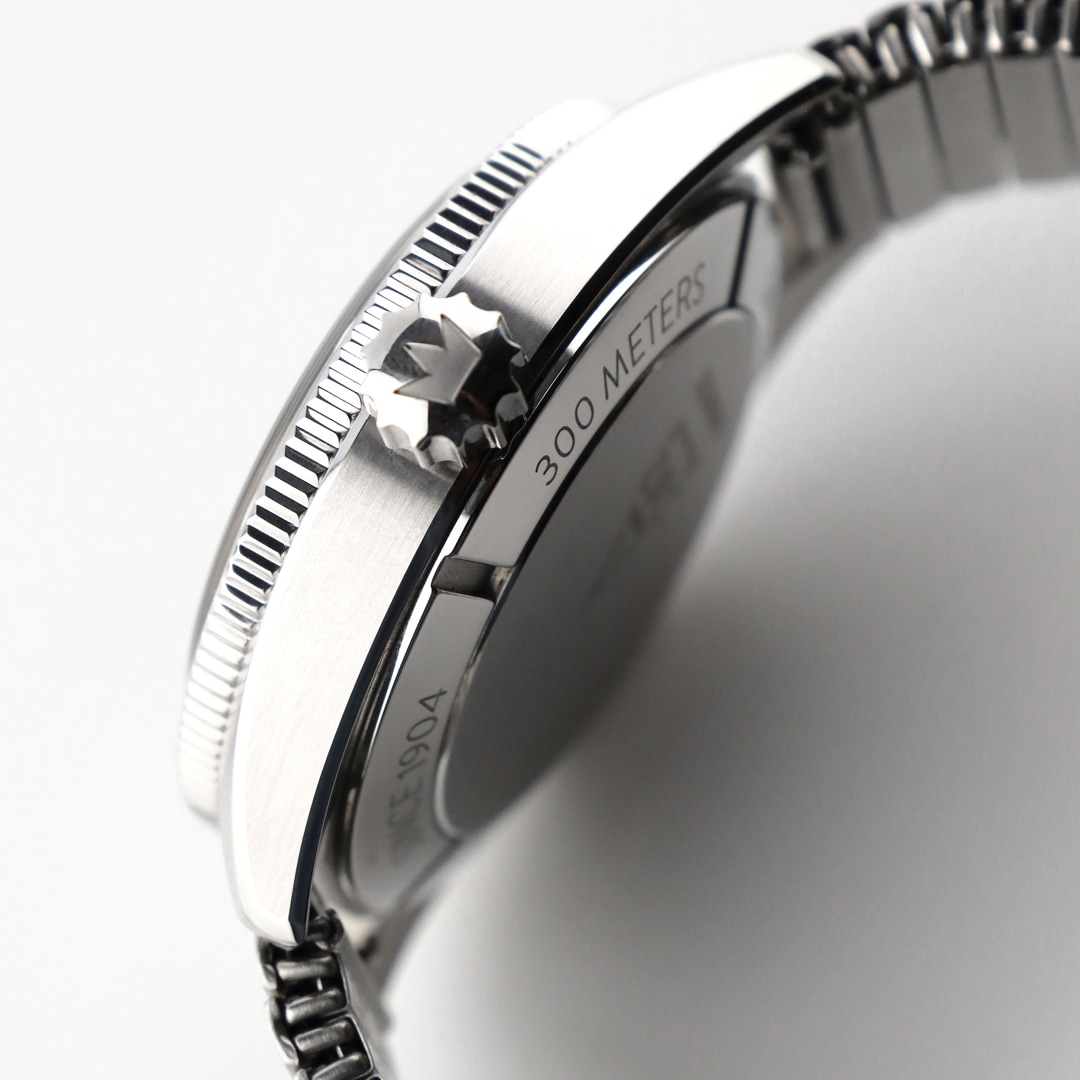 Getreu ihrem Vorbild besticht sie durch ein faszinierendes, schwarz guillochiertes Zifferblatt und eine Lünetteneinlage, die aus demselben Messing doppelter Stärke gefertigt ist und so eine unübertroffene optische Tiefe erzeugt. Das satinierte Edelstahlgehäuse verfügt über ein historisch korrektes, kreisförmig gebürstetes Finish, das perfekt mit dem markanten Vintage-Expansionsarmband aus Metall harmoniert und für einen echten Retro-Chic-Look sorgt.